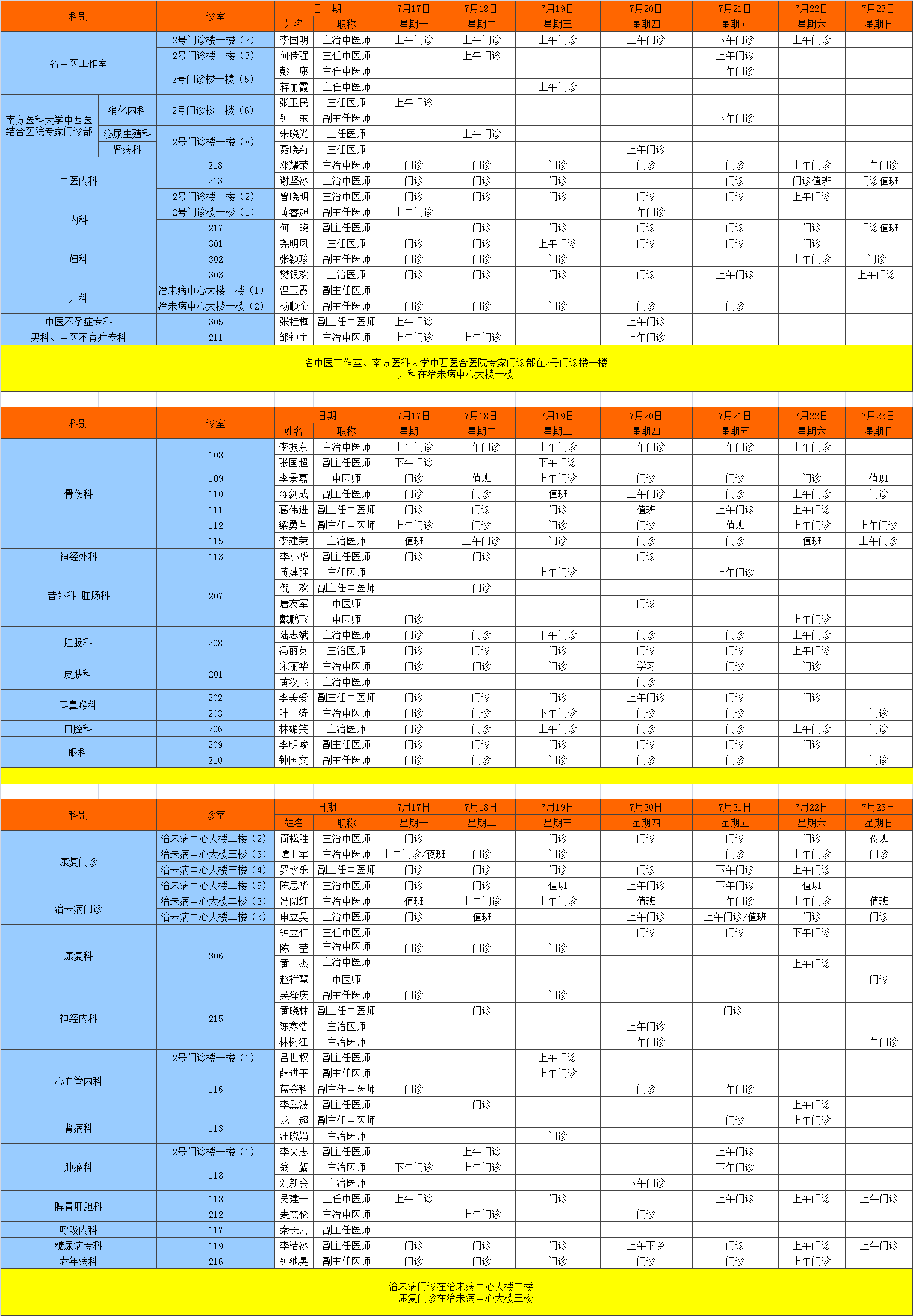 鹤山市中医院门诊医生每周出诊一览表(7月17日-7月23日)