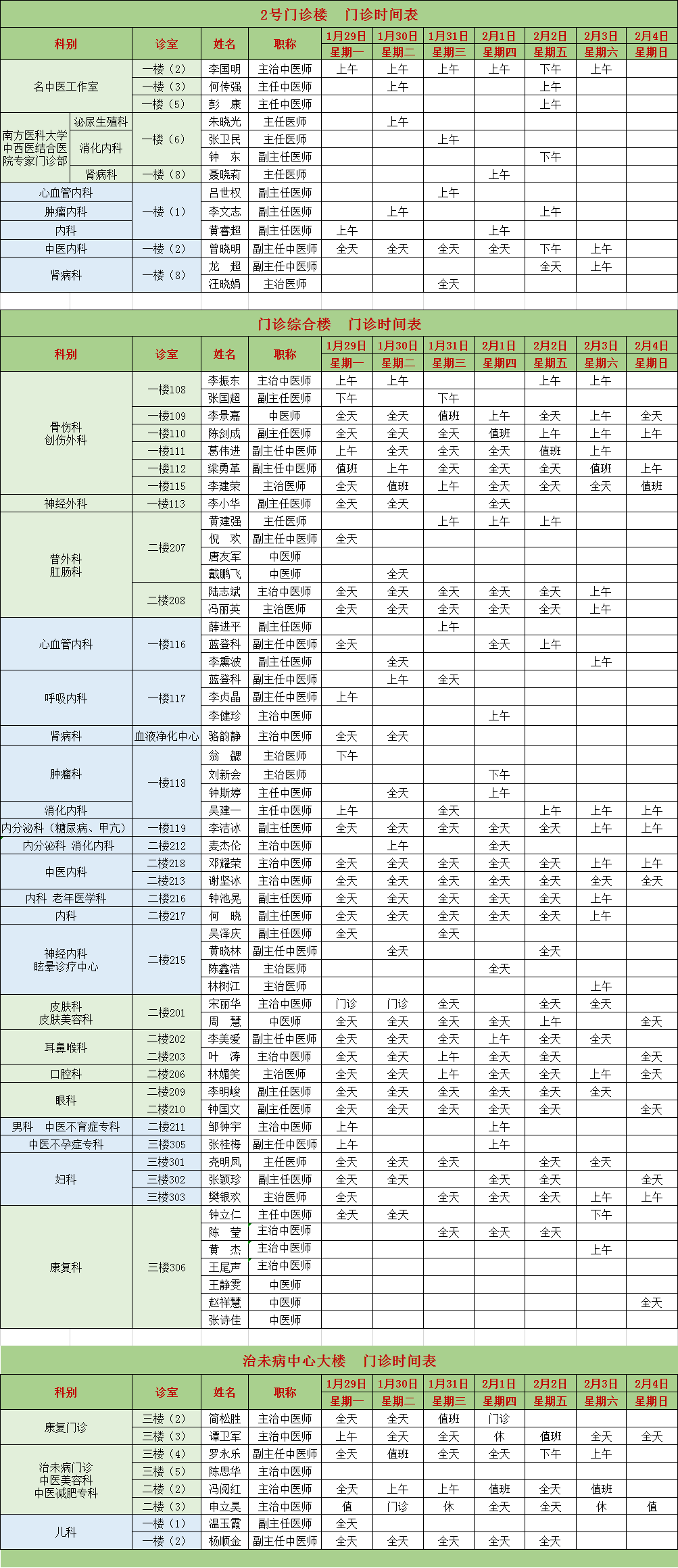 鹤山市中医院门诊医生每周出诊一览表(2024年1月29-2月4日)