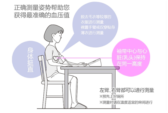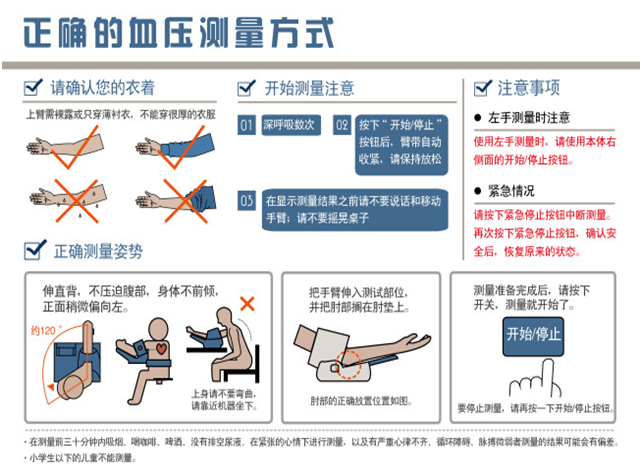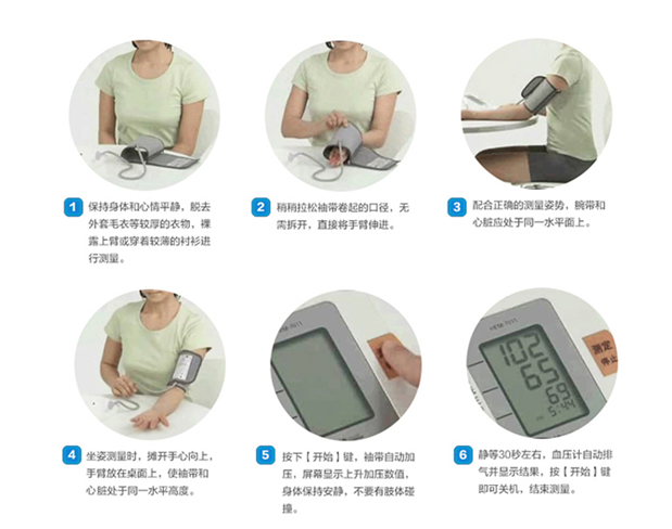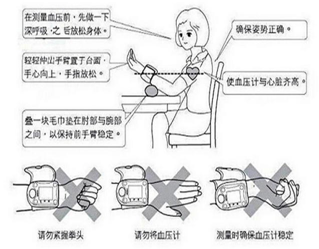 现在,电子血压计使用便捷,已经成为家庭血压的主要测量工具。电子血压计有臂式和腕式之分,那么家庭血压的日常监测中电子血压计要怎么使用才正确呢? 一.臂式电子血压计使用方法 正确的测量姿势  步骤图示  二.腕式电子血压计使用方法 正确测量姿势   三.血压测量的关键点 1、要准确的测量,必须正确地缠上袖带。 2、每天应在同一时间段进行测量(建议起床后1小时以内或就寝前测量)。 3、坐在椅子上,身体挺直放松。 4、测量过程中请保持自然姿势,身体不要移动,保持安静状态。  四.使用注意事项 1、测量前安静休息片刻,以消除紧张、劳累对血压的影响; 2、被检查者手臂应与心脏位置同高; 3、袖带放置平展,松紧度以插入两个手指为宜; 4、一般连测2-3次(每次应间隔5分钟),取其平均值。(图片来源:百度图片 如涉及版权问题请联系作者删除)