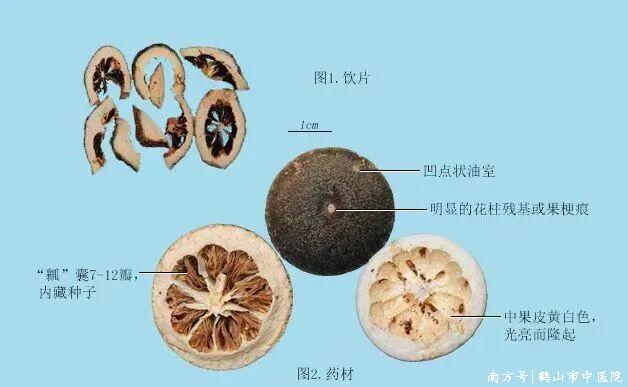 关键特征:“半球形”,外皮青褐有颗粒及凹点,内面黄白,瓤囊棕褐成列,气香浓。