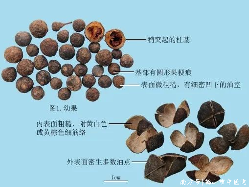 外形呈类球形,直径1-2厘米(较小)。外表面呈灰绿色、黑绿色或微带紫色,具细密小油室(小凹点状)和明显的网状皱纹。顶端有微凸起的花柱残基,基部有圆形果柄痕。质地坚硬。横切面可见4-8瓣未成熟的小瓤囊(颜色深),种子多为卵圆形,淡黄棕色。气味辛香浓烈,味苦、辛。