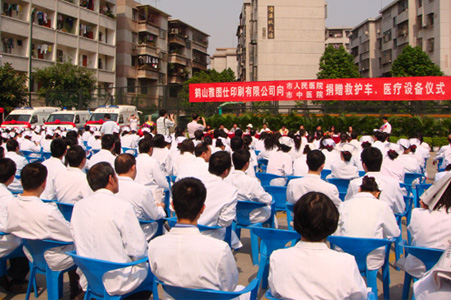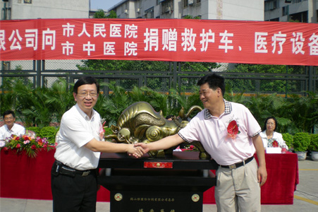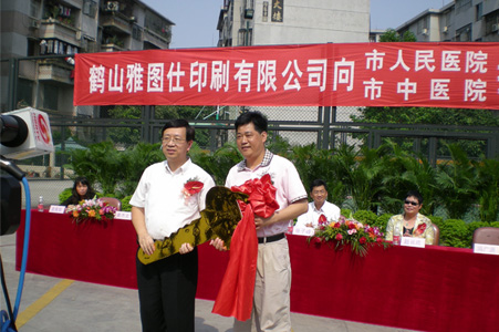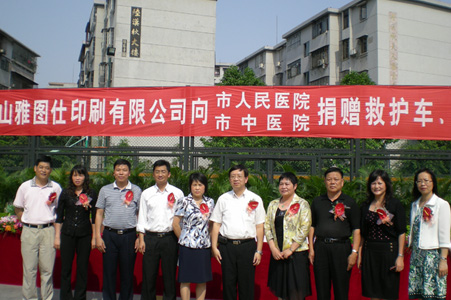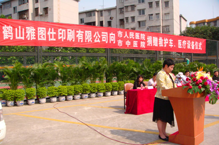 | 4月28日下午,在市人民医院篮球场举行鹤山雅图仕印刷有限公司向鹤山市人民医院和中医院赠送救护车和医疗设备捐赠仪式。鹤山市委副书记赵长欢,鹤山市人大常委会副主任、鹤山市人民医院副院长张子峰,鹤山市人民政府副市长赖燕芬女士,鹤山市工商联主席、市总商会会长、鹤山雅图仕印刷有限公司董事长冯广源,鹤山市委统战部副部长、工商联党组书记左方妍,鹤山市民政局副局长麦美菊,鹤山市人民医院院长李桂强,鹤山市中医院院长黄杰文等出席了捐赠仪式。