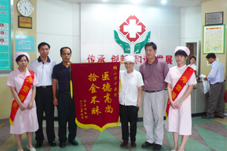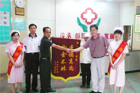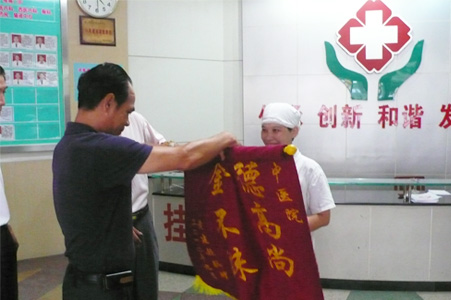 9月20日下午,一位病人手拿一面锦旗来到我院,锦旗上金色的八个大字“拾金不昧、医德高尚”十分闪耀,这面锦旗是送给我院员工钟笑容的。 事情发生在9月15日,我院员工钟笑容同志在急诊输液中心拾获钱包一个,钱包内有现金4000多元,银联卡一张、银行银卡一张、身份证、驾驶证和大量金额的票据凭证等物品,钟笑容同志捡到钱包后主动寻访失主并交还钱包。 为了表示感谢,失主黄先生特别制作了一面锦旗,赞扬我院员工拾金不昧的美德。