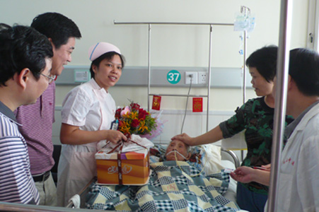 10月7日是一个特殊的日子,从我院住院部内科病房传来了阵阵的欢声笑语,正在我院留医的王楚枫老人迎来了百岁寿诞。在充满温馨的病房里,在众多医护人员的陪伴下,度过了一个特殊而难忘的生日。上午11点,黄杰文院长带领院领导班子成员及相关职能科室领导一行十多人来到内科,和科室医护人员一起为王楚枫老人庆贺100岁生日,院方除了送上贺卡外,还同时送上慰问金和鲜花一束、生日蛋糕一个。黄院长代表医院向王楚枫老人表示祝福,祝福她生日快乐,早日康复。王楚枫老人和她的家人非常感动,家属送上果蓝以表达对院领导及科室医护人员的感激之情。