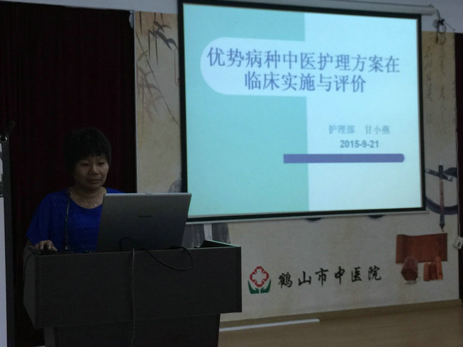 本次学习班由我院护理部甘小燕主任主讲,涵盖了国家中医药管理局确定的33个优势病种中医护理方案,甘主任将中医护理方案的内容、中医护理方案护理效果评价内容、开展护理效果评价的方法等用直观、形象的多媒体课件结合生动的讲课,使每位听课者对33个中医护理方案有了明确的认识。