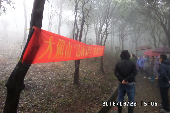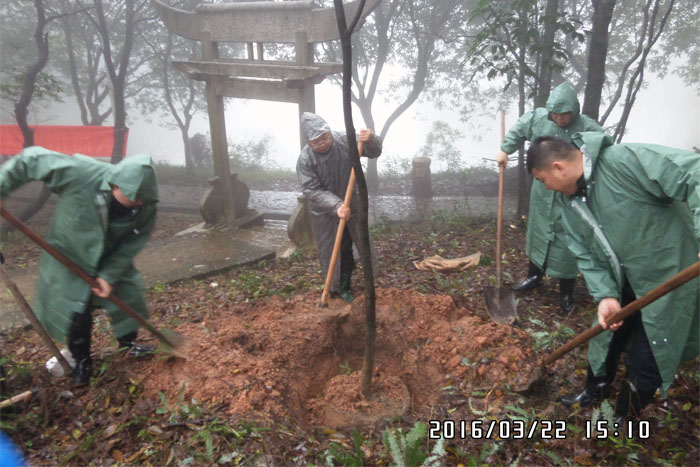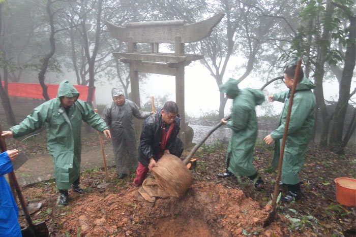 在大雁山义务植树点上,虽然下着蒙蒙细雨,但是大家植树热情不减,三五成群,分工协作,有的挥锹铲土,有的栽种培土,经过一个多小时的紧张劳动,一棵棵新树迎风挺立,沐浴在春光里,大家脸上洋溢着劳动后的喜悦和欣慰。