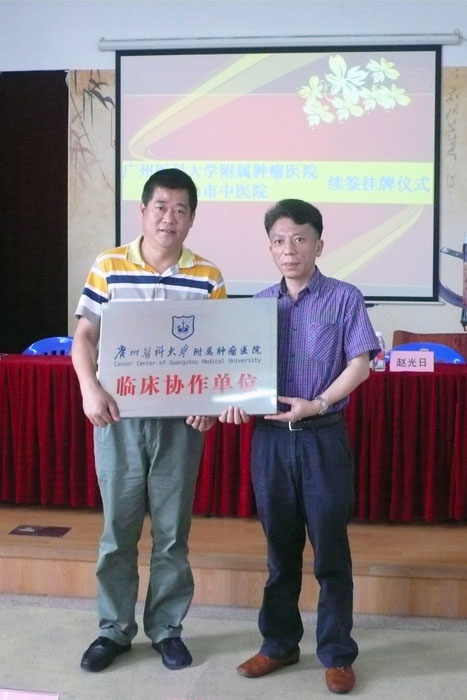 5月5日上午,我院与广州医科大学附属肿瘤医院举行协作医院续签授牌仪式。授牌仪式由我院李文志副院长主持,广州医科大学附属肿瘤医院副院长胡伟民、鹤山市卫计局副局长陈魏瑜和我院中层干部出席仪式。 我院黄杰文院长在致辞时表示,通过两院的继续协作,我院将充分依托肿瘤医院先进的管理理念、精湛的技术优势、强大的专家团队,促进我们中医院强化学科建设、加快人才培养、提升服务品质,更好地为广大患者服务,为我市的中医事业发展做出新的更大的贡献。 广州医科大学附属肿瘤医院副院长胡伟民在讲话时表示,两家医院的继续协作,是延续两家医院的资源共享、优势互补、互惠互利、共同发展,肿瘤医院将继续全方位积极支持中医院的发展,让广大患者不出鹤山就能享受到高水平的医疗服务。 卫计局副局长陈魏瑜在讲话中指出:肿瘤医院与鹤山市中医院协作医院的续签授牌,是我市医疗卫生战线上的一件大喜事,对深化我市医疗体制改革,加快我市医疗卫生事业发展,提高诊疗技术水平,方便群众就医等,都将起到积极的推动作用。必将为我市卫生事业的发展提供新的管理经验,必将为广大人民群众提供更好的医疗服务。 授牌仪式结束后,肿瘤医院医务科副主任闫冰川开展了相关主题的学术讲座。