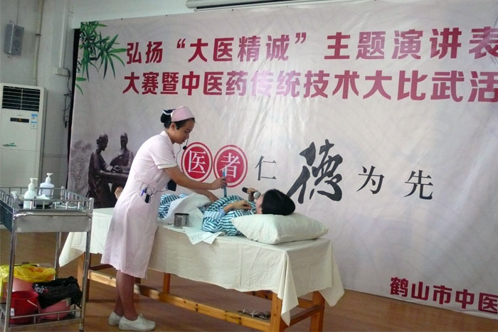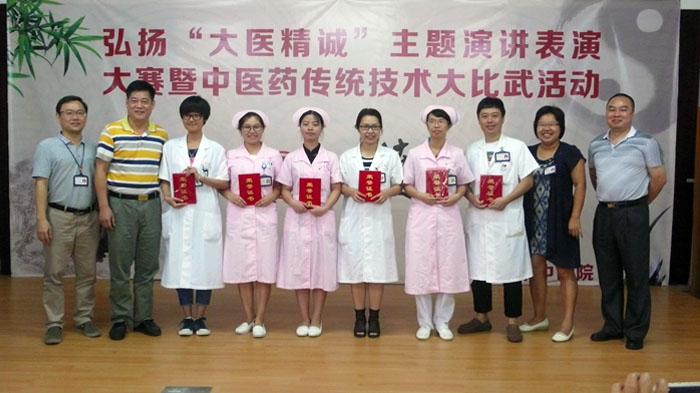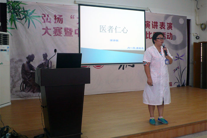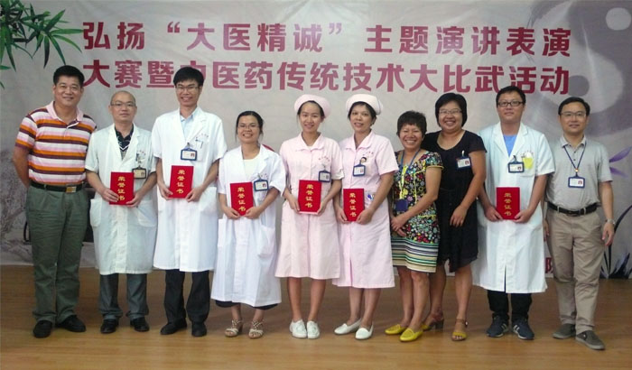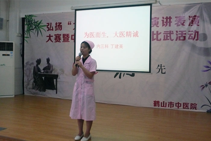 近日,我院举办“大医精诚”主题演讲比赛暨中医药传统技术大比武活动,全院共17名选手参加了比赛。 比赛分两个阶段进行,首先进行“大医精诚”主题演讲比赛。比赛选手围绕《大医精诚》、《黄帝内经》、《伤寒论》等经典条文背诵表演,或以演讲的形式诠释“大医精诚”精神。演讲比赛吸引了广大医务人员的踊跃参与,同时邀请了院领导及各科室的代表到场观看了比赛。选手们结合工作实例,阐述了他们对大医精诚的理解,其中内三科的丁建英,通过身边的事迹讲述“为医而生,大爱无言”的精神让人印象深刻,获得演讲比赛的第一名。    第二部分是中医药传统技术大比武,包括现场PPT汇报、技术展示及答辩。针灸推拿科的谭卫军通过腹针技能展示,获得中医药传统技术大比武的第一名,评委一致认为,他的针法有较强的实用性、操作性、创新性和可推广性。     本次比赛的目的是“弘扬大医精诚精神,提升中医药服务能力”,既传承了中医药优秀文化,又树立了卫生行业新风。选拔赛的获奖者,将代表鹤山市中医药系统参加江门市卫生和计划生育局举办的“大医精诚”主题演讲比赛暨中医药传统技术大比武决赛。