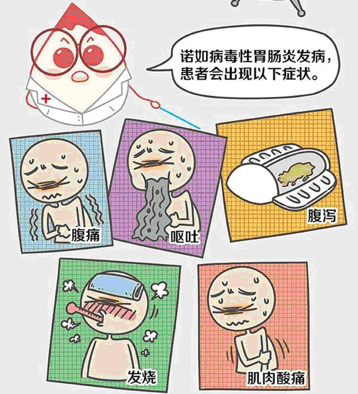 潜伏期一般为1~2天,常见症状包括恶心、呕吐(儿童患者最常见)、胃痛、腹痛、腹泻,有时还会伴有发烧、头痛、肌肉酸痛等症状。通常在1~3天内好转,绝大多数人1周内可以康复。最容易出现脱水的是孩子、老人和本来就有病在身的人。