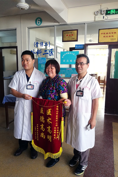 据了解,阿姨姓冯,67岁,曾是全国劳动模范、江门市人大代表及鹤山市的热心义工。她于2017年6月11日在家中不慎跌倒,致双肘部肿痛、活动受限,到我院就诊,诊断为:右肱骨小头骨折、左肱骨髁上骨折。入院后,予左肱骨髁上骨折手法复位夹板外固定,但因右肱骨小头骨折移位明显,影响功能。故第二天行右肱骨小头骨折切开复位空心钉内固定术,术后伤口愈合出院,其后一直随诊复查。患者认为任国雄主任、文海峰医师态度和蔼可亲,看病仔细严谨,医术高明,医德高尚。在外二科全体医护人员悉心照料下,现病情恢复良好,冯姨对治疗效果十分满意,故送上一面锦旗表示感谢。