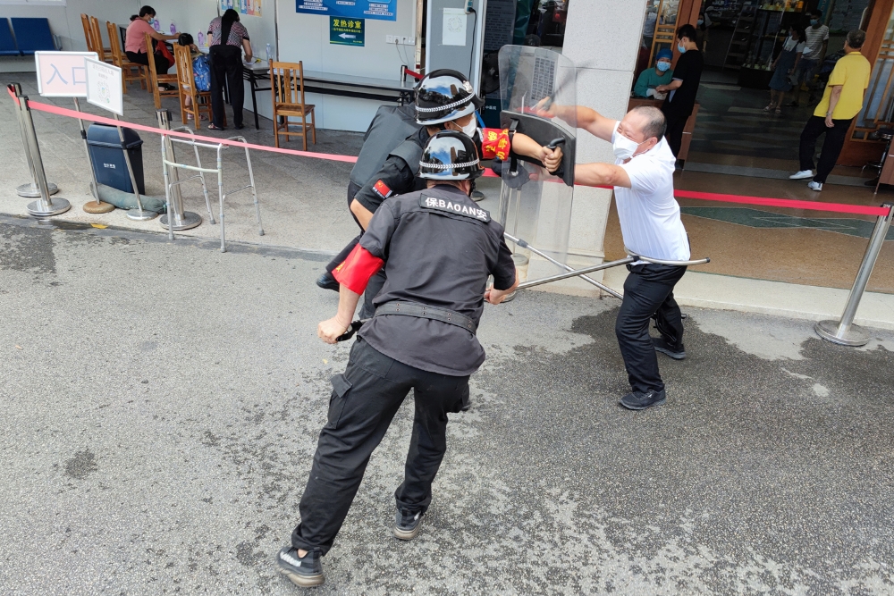 防患胜于救难,此次模拟演练贴近实际,既严肃紧张,又进退有序。本次培训演练,主要围绕反恐防暴基本知识和安保器械使用两方面展开。通过现场教学、亲身体验、交流互动、模拟实战等方式,对参训安保人员进行重点培训,确保在遇到突发、紧急事件时,安保人员能够及时发挥防暴器械的作用,同时增强安保人员的信心、意识和能力,进一步增强了医护人员的安全防范意识和突发事件处理能力,为做好疫情防控和安全生产提供有力保障。
