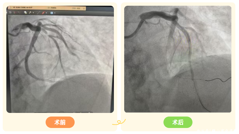 患者生命体征刚趋稳定,心内科介入团队立即启动导管室。冠脉造影显示患者心脏冠状动脉前降支血管次全闭塞,随时可能完全堵塞。心脏介入团队争分夺秒,仅用22分钟就完成导丝通过、球囊扩张和支架植入,使闭塞血管血流恢复至正常水平(TIMI3级)。在成功开通血管后,患者转心脏重症监护室(CCU)进一步治疗,通过抗血小板、稳定斑块、控制血压及改善心功能等综合治疗,患者胸痛缓解,心肌损伤标志物恢复正常,已于近日康复出院。