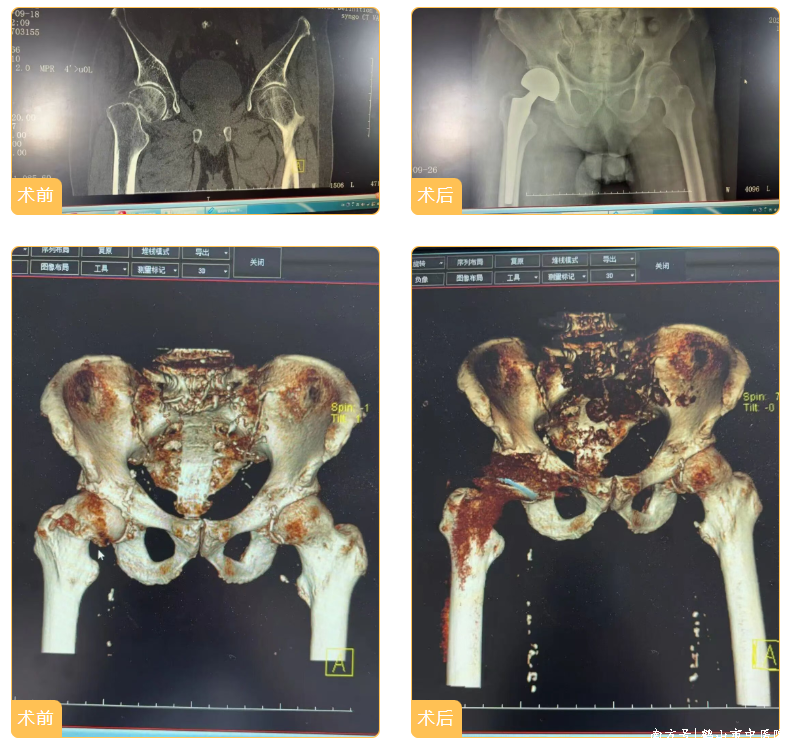完善术前准备后,由任国雄主任团队为患者施行“右侧人工股骨头置换术”,手术在良好的麻醉状态下采用微创切口完成,过程顺利,历时50分钟,术中出血约100ml。术后患者疼痛显著缓解,精神状态逐步改善,术后第二天,刘爷爷即可在助行器辅助下下床活动,并在康复团队指导下进行早期功能锻炼。出院前复查CT显示:人工股骨头假体位置良好,无脱位征象。此时刘爷爷已能熟练使用助行器进行行走活动,达到预期康复目标。