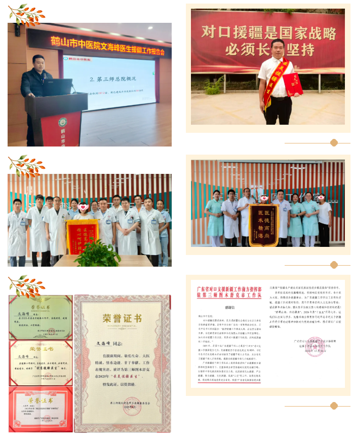 2025年6月30日,文海峰副主任中医师响应国家柔性医疗援疆号召,跨越数千里,抵达新疆生产建设兵团第三师图木舒克市总医院,开始了为期半年的医疗援疆工作。援疆期间,文海峰副主任中医师担任新疆生产建设兵团第三师图木舒克总医院脊柱外科第一特聘主任,他克服多重困难和挑战,不仅以精湛医术填补医院多项医疗技术空白,助力该院成功创建三级甲等综合医院,更以无私奉献的实际行动架起了粤疆交往、民族交融的桥梁。因援疆工作表现突出,文海峰医生获评“最美援疆医生”、“优秀援疆医生”、“优秀导师带徒”等称号。
